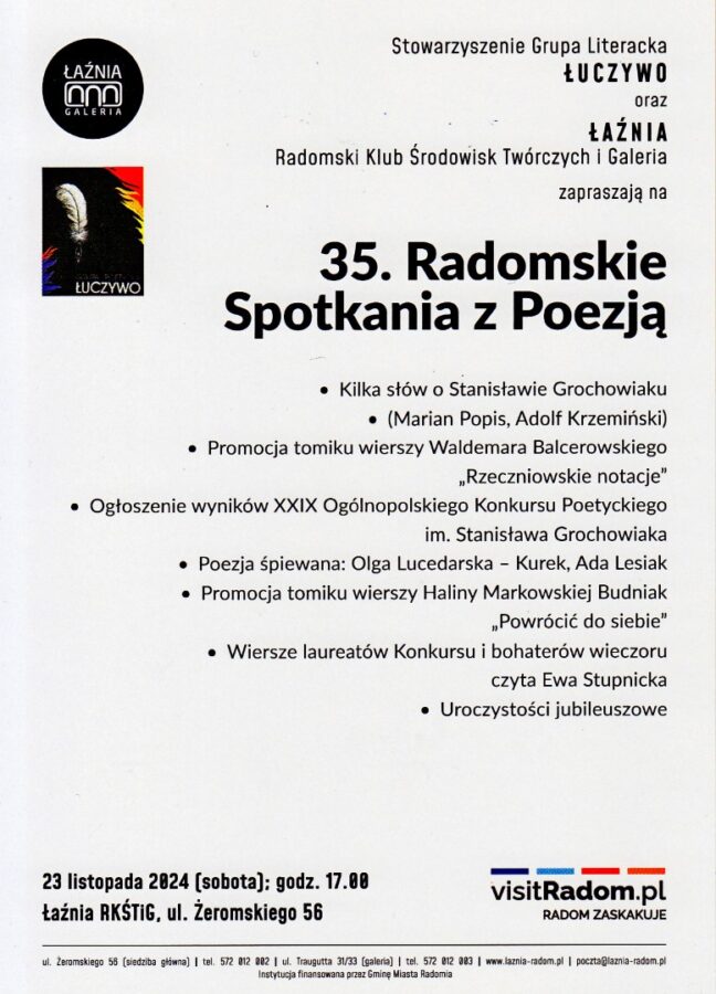 Stowarzyszenie Grupa Literacka „Łuczywo” oraz Radomski Klub Środowisk Twórczych „Łaźnia” zaprasza na wyjątkowe wydarzenie literackie.