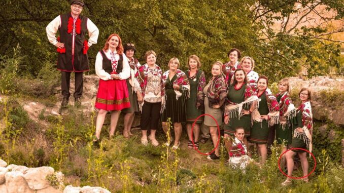 Gdy dokładniej przyjrzymy się zdjęciu, można zauważyć, że widać ślady obróbki graficznej, np. tuszowanie fragmentów zdjęcia wycinkiem chusty noszonej przez jedną z gospodyń. Najbardziej rzucają się w oczy… nogi, które nie należą do żadnej z osób na fotografii, po środku i po prawej stronie zdjęcia.