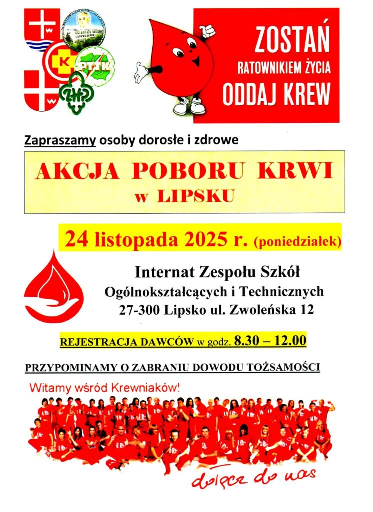 W poniedziałek, 24 listopada 2025 roku, w Internacie Zespołu Szkół Ogólnokształcących i Technicznych w Lipsku będzie można oddać krew.