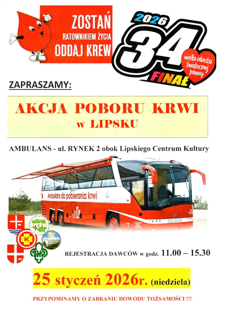 Akcja poboru krwi w Lipsku podczas finału WOŚP 22 stycznia 2026 MZ Weekendowo 0 Czas czytania: < 1 minutęTradycyjnie już podczas finałów WOŚP w Lipsku organizowana jest akcja krwiodawstwa. W tym roku w ambulansie w centrum miasta. Punkt czynny od 11.00 – do 15.30. krewwośpWspieraj MojeLipsko – pomóż nam się rozwijać