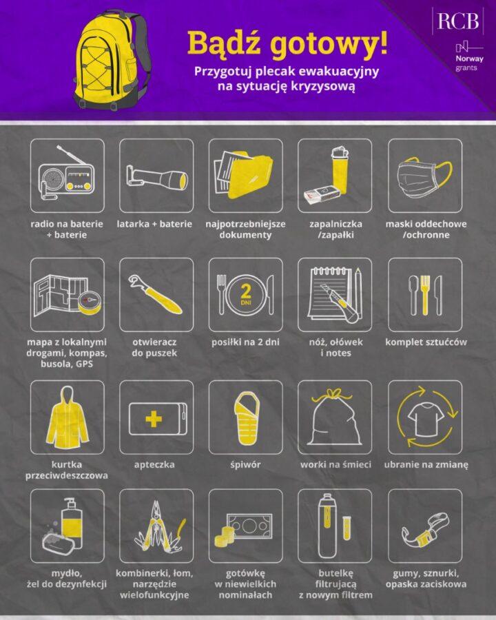 Bądź gotowy – plecak ewakuacyjny 28 sierpnia 2025 MZ Wiadomości 0 Czas czytania: < 1 minutęCo powinno się znaleść w plecaku w przypadku ewakuacji na wypadek wojny i kryzysu? Rządowe centrum Bezpieczeństwa informuje! bądź gotowykryzyswojnaWspieraj MojeLipsko – pomóż nam się rozwijać
