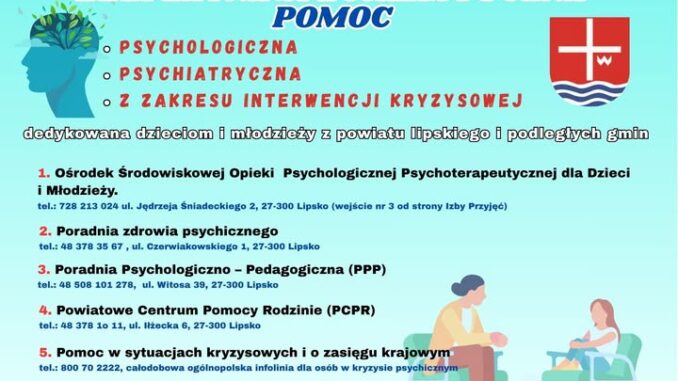 Gdzie szukać pomocy psychologicznej i psychoterapeutycznej dla dzieci i młodzieży? W powiecie lipskim funkcjonuje kilka placówek oferujących bezpłatną pomoc psychologiczną, psychoterapeutyczną oraz psychiatryczną dla dzieci i młodzieży – zarówno w formie indywidualnej, rodzinnej, jak i środowiskowej. Poniżej przedstawiamy informacje o dostępnych ośrodkach i formach wsparcia: