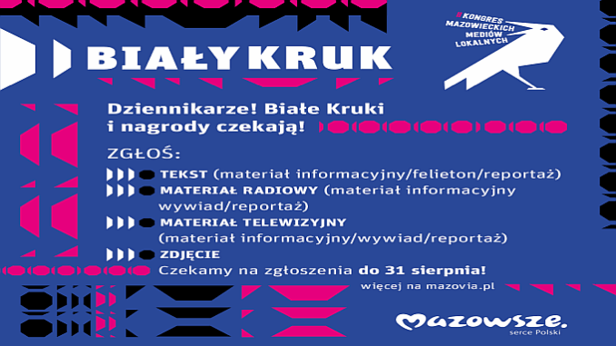 Jesteś dziennikarzem, który pisze o sprawach ważnych dla lokalnych mieszkańców? Umiesz uchwycić piękno Mazowsza na fotografiach? Zgłoś się do drugiej edycji konkursu „Biały Kruk”. Nabór trwa do 31 sierpnia. W tym roku są wyższe nagrody i jest więcej kategorii.