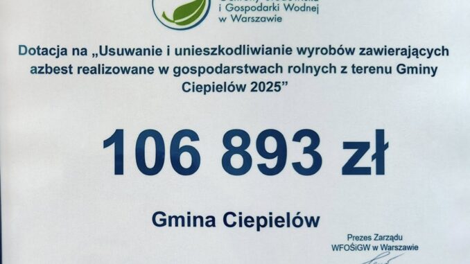 Gmina Ciepielów dotrzymała dofinansowanie na usuwanie azbestu. Jak podkreślił Burmistrz, jest to jedna w większych kwot na ten cel w subregionie radomskim.