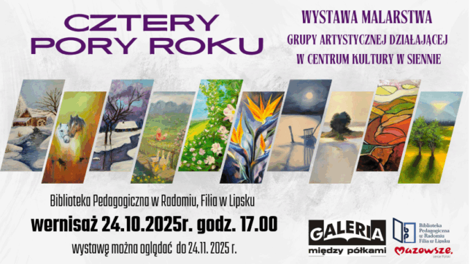 Biblioteka Pedagogiczna w Radomiu Filia w Lipsku serdecznie zaprasza na otwarcie wystawy „Cztery pory roku”, będącej podsumowaniem twórczej pracy grupy artystycznej działającej przy Centrum Kultury w Siennie pod kierunkiem Andrzeja Białeckiego – wybitnego lipskiego malarza i pedagoga, od lat wspierającego rozwój lokalnych talentów.