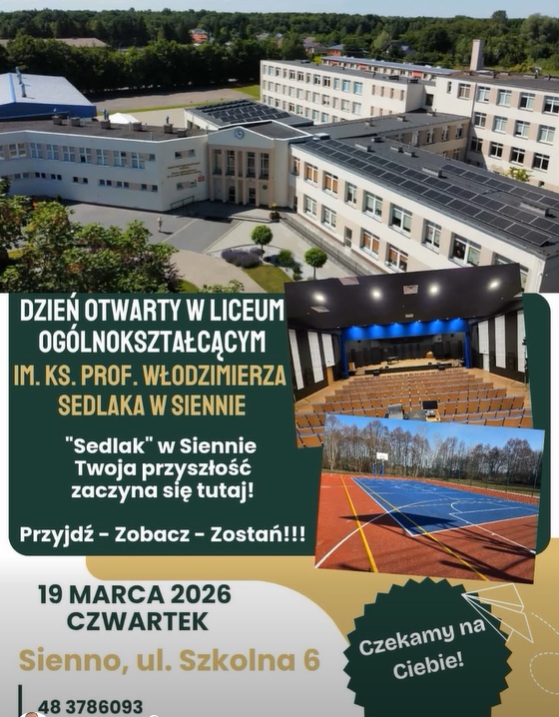 Dzień otwarty w Sedlaku 8 marca 2026 MZ Wiadomości 0 Czas czytania: < 1 minutęJuz 19 marca odbędzie się dzień otwarty w Liceum Ogólnokształcącym w Siennie. sedlakSiennoWspieraj MojeLipsko – pomóż nam się rozwijać
