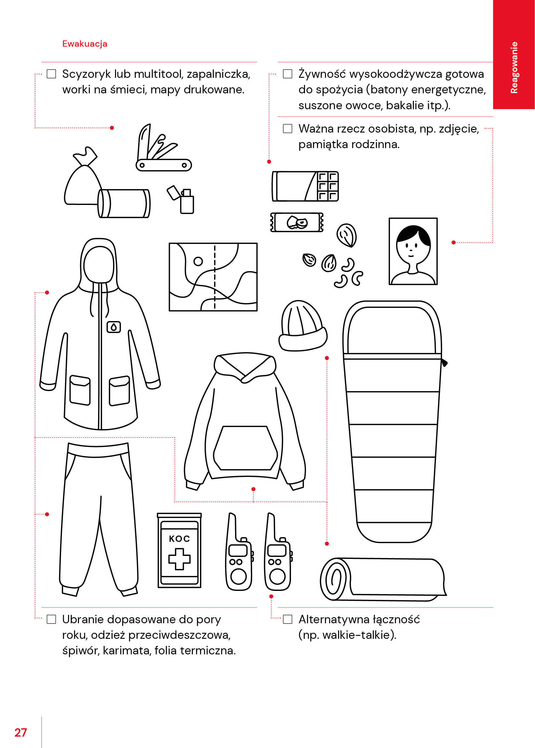 - Ubranie dopasowane do pory roku, odzież przeciwdeszczowa, śpiwór, karimata, folia termiczna.