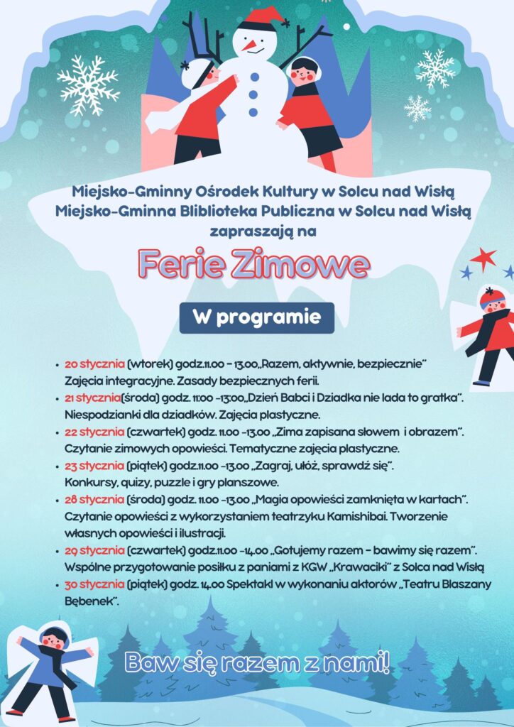 • 20 stycznia (wtorek) godzina 11 -13.00 Razem. aktywnie, bezpiecznie” Zajęcia integracyjne. Zasady bezpiecznych ferii.