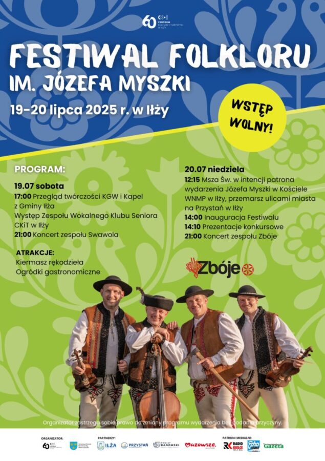 Już za niespełna miesiąc Iłża ponownie stanie się centrum folkloru i tradycji – wszystko za sprawą Festiwalu Folkloru im. Józefa Myszki, jednego z najważniejszych wydarzeń kulturalnych w regionie. Tegoroczna edycja odbędzie się w dniach 19–20 lipca na terenie Przystani – Aktywnej Strony Iłży, kontynuując wieloletnią tradycję spotkań miłośników muzyki ludowej, tańca i rękodzieła.