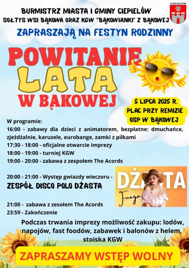 BURMISTRZ MIASTA I GMINY CIEPIELÓW oraz SOŁTYS WSI BĄKOWA wraz z KGW „BĄKOWIANKI” Z BĄKOWEJ ZAPRASZAJA NA FESTYN RODZINNY!