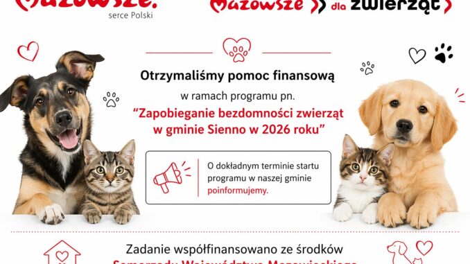 Władze gminy Sienno skutecznie pozyskały fundusze na realizację zadania pod nazwą „Zapobieganie bezdomności zwierząt w gminie Sienno w 2026 roku”. Na ten cel przyznano kwotę 15 000 zł.