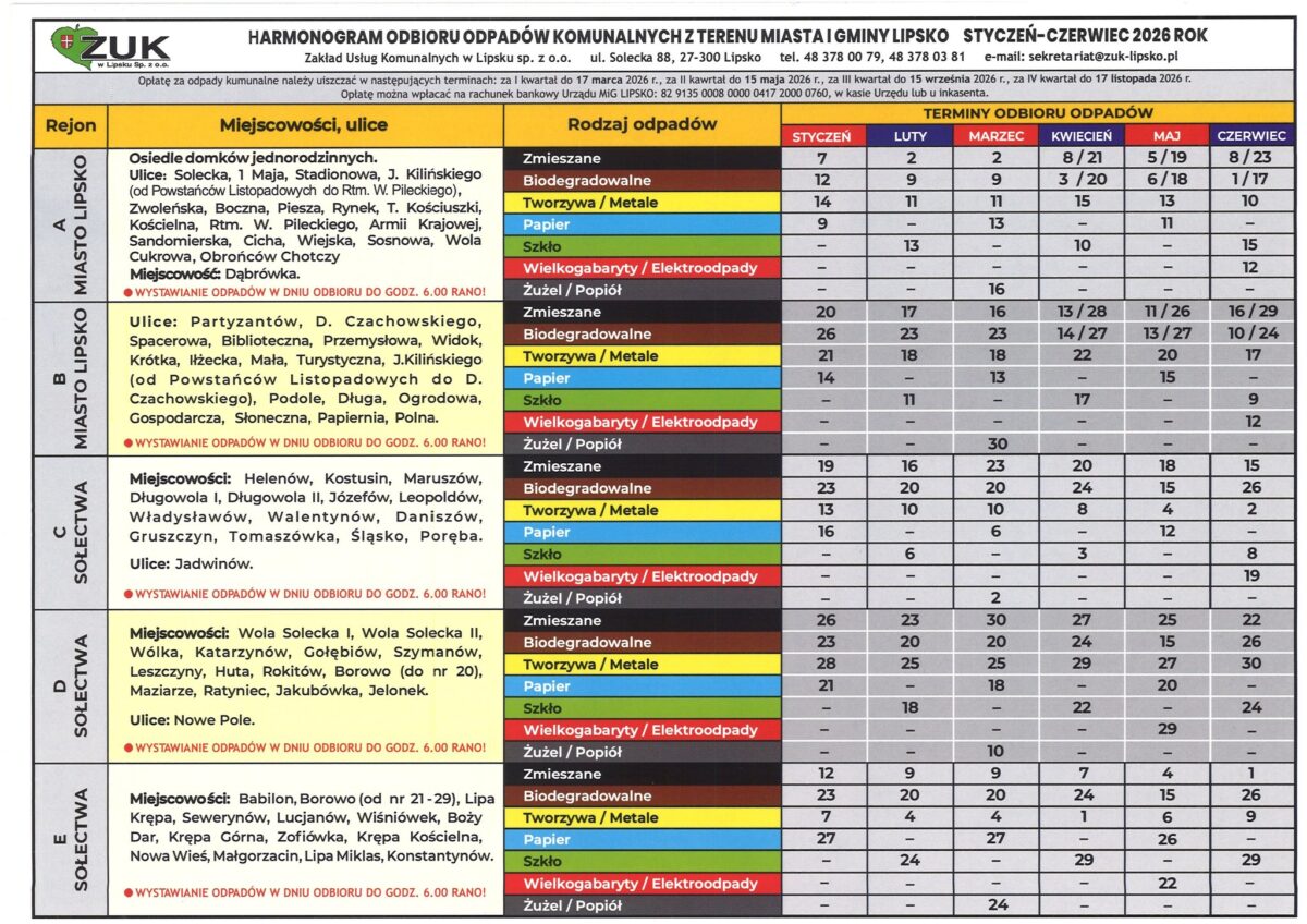 Komunikaty Harmonogram odbioru odpadów w gminie Lipsko 2 stycznia 2024 rafales Komunikaty 0 Urząd Miasta i Gminy Lipsko informuje, […]