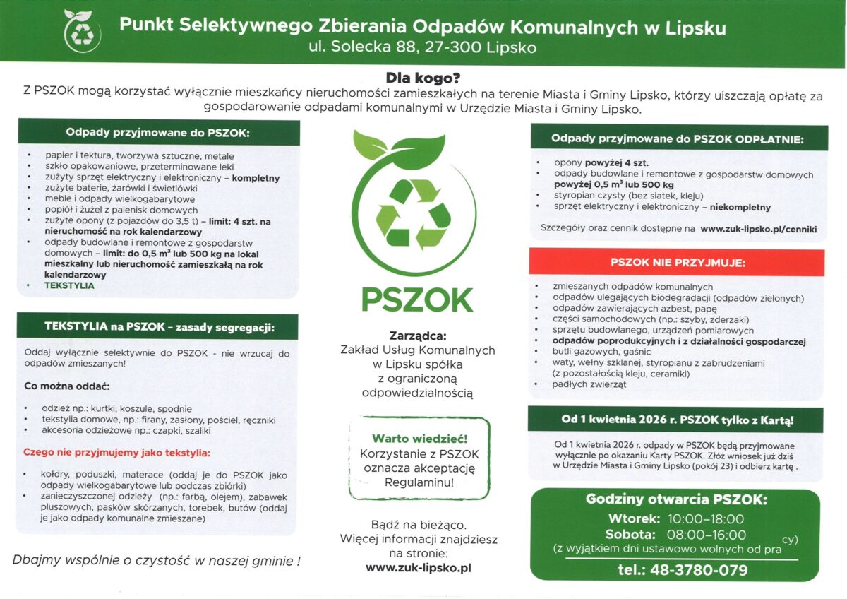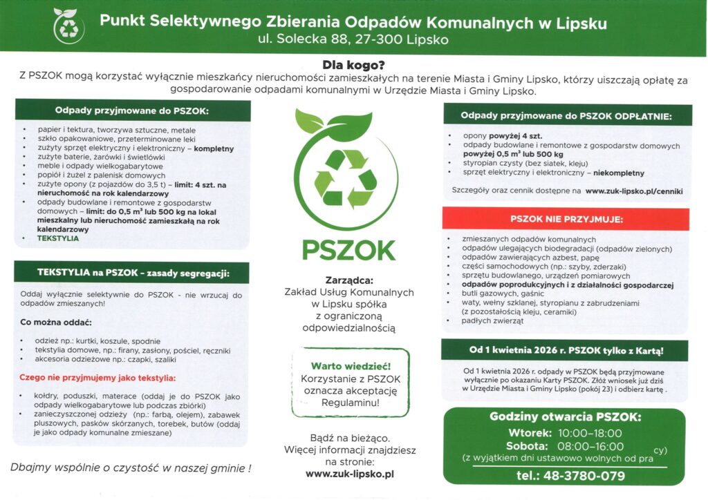 Harmonogram odbioru odpadów w Gminie Lipsko na 2026 rok 30 grudnia 2025 MZ Komunikaty 0 Czas czytania: < 1 minutę Zakład Usług Komunalnych w Lipsku przedstawia Harmonogram odbioru odpadów na pierwszą połowę 2026 roku. Czysta przestrzeń wokół nas to efekt codziennych nawyków – takich jak regularny wywóz śmieci. harmonogram odbioru odpadówśmieciWspieraj MojeLipsko – pomóż nam się rozwijać