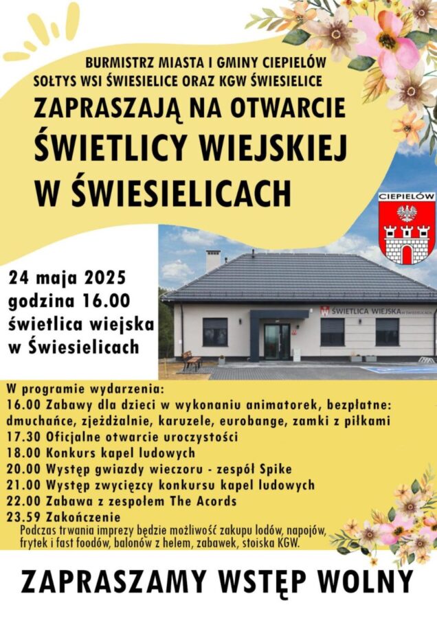 Huczne otwarcie świetlicy w Świesielicach 8 maja 2025 rafales Rozrywka 0 Czas czytania: < 1 minutęBurmistrz, sołtys oraz KGW Świesielice zapraszają na huczne otwarcie nowej Świetlicy Wiejskiej. W programie mnóstwo atrakcji dla dzieci i dorosłych. Odbędzie się Konkurs Kapel Ludowych, wystąpią też zespoły SPIKE i THE ACORDS 24 maja, godzina 16:00. świesieliceWspieraj MojeLipsko – pomóż nam się rozwijać
