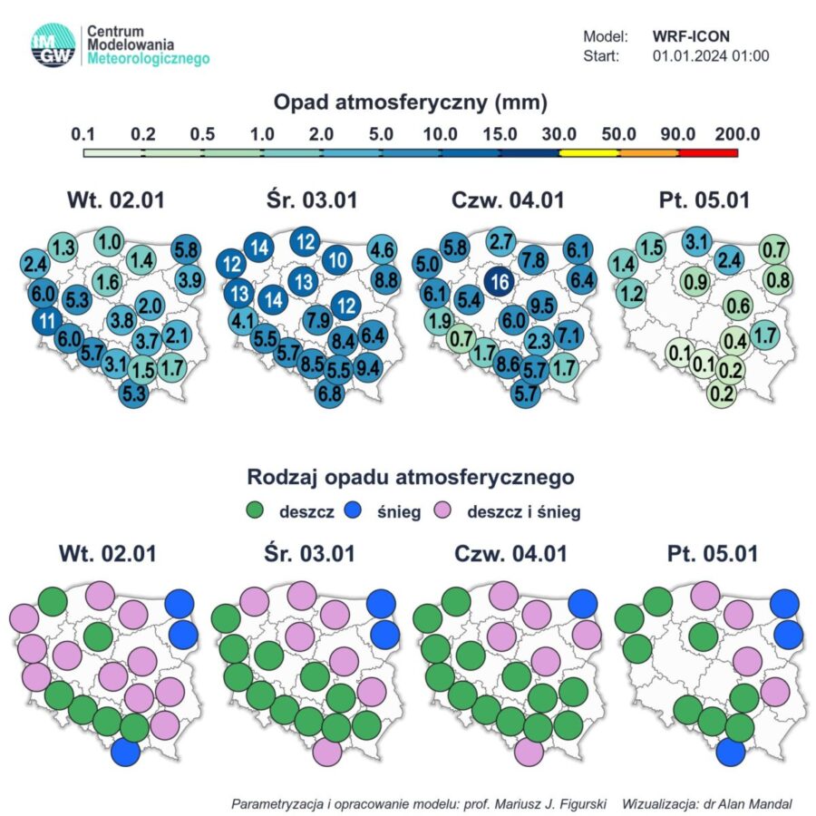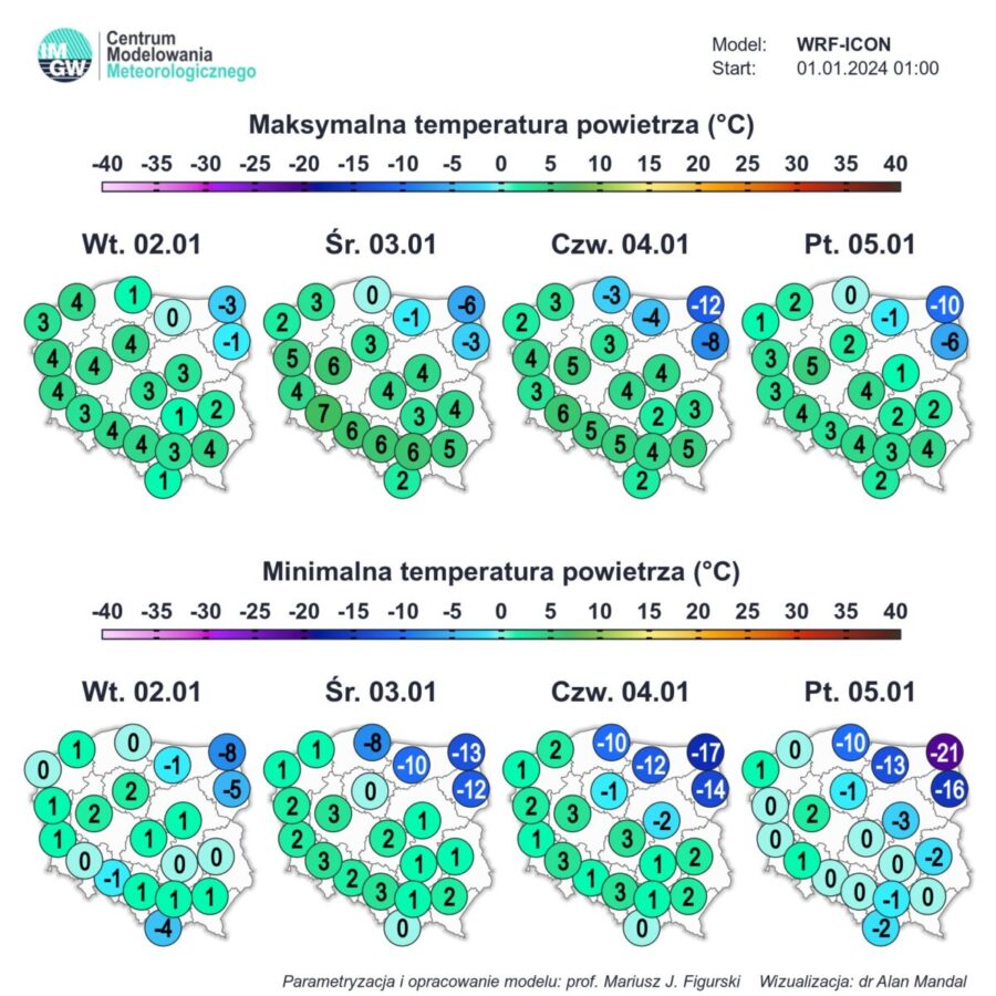 W rejonie Mazur, Warmii i Podlasia spadnie do 3 centymetrów śniegu. Temperatura maksymalna wyniesie od -5 stopni Celsjusza na Suwalszczyźnie do 7 st. C na Dolnym Śląsku. Z kierunków zmieniających się powieje słaby i umiarkowany, miejscami silniejszy wiatr.