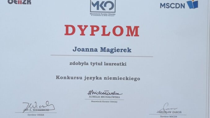 Joanna Magierek, uczennica 8 klasy z powiatu lipskiego, otrzymała tytuł Laureata Konkursu Przedmiotowego z języka niemieckiego!