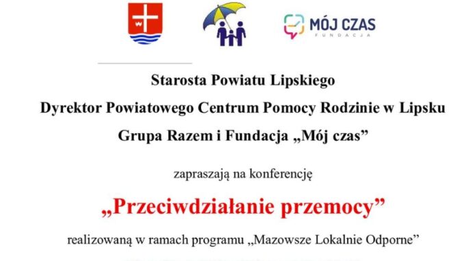 Starosta Powiatu Lipskiego Dyrektor Powiatowego Centrum Pomocy Rodzinie w Lipsku Grupa Razem i Fundacja „Mój czas” zapraszają na konferencję „Przeciwdziałanie przemocy” realizowaną w ramach programu „Mazowsze Lokalnie Odporne”