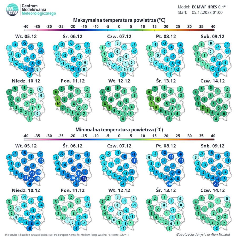 Środa przyniesie opady białego puchu. W czwartek śnieg pojawi się głównie na wschodzie. Piątek przyniesie większe przejaśnienia, a mróz utrzyma się jedynie na wschodzie. W sobotę nadejdą większe zmiany, wraz z frontem atmosferycznym, który przyniesie opady śniegu przechodzącego w deszcz, z możliwością oblodzenia.