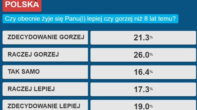 Na grafice tytułowej widać, że ponad 47 % Polaków ocenia, że żyje się gorzej niż 8 lat temu.