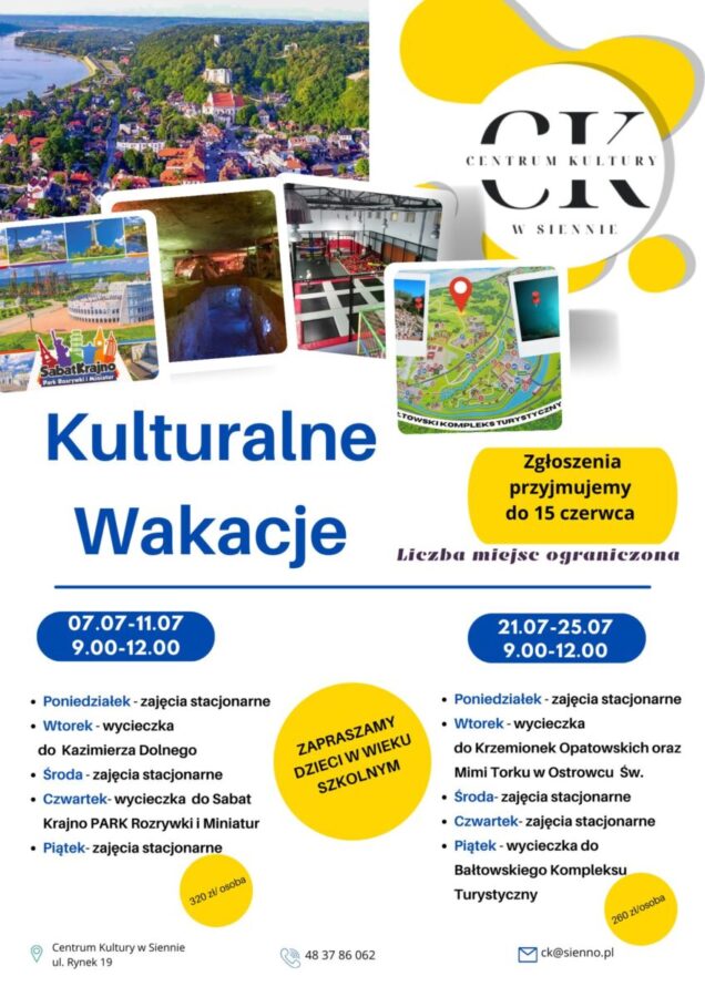 Centrum Kultury w Siennie zaprasza dzieci i młodzież w wieku szkolnym na niezapomniane wakacyjne przygody! W programie dwutygodniowe warsztaty, wycieczki i atrakcje, które umilą letni czas i pozwolą zdobyć nowe umiejętności oraz poznać ciekawe miejsca.