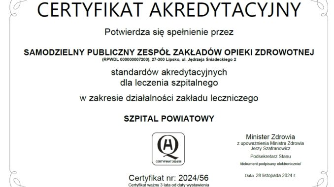 Samodzielny Publiczny Zespół Zakładów Opieki Zdrowotnej w Lipsku otrzymał Certyfikat akredytacyjny Centrum Monitorowania Jakości wydany przez Ministerstwo Zdrowia.