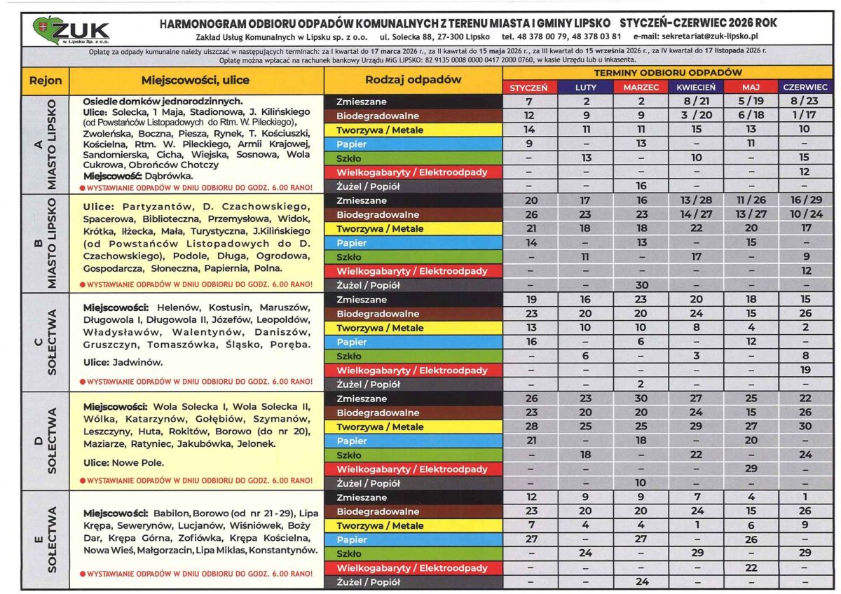 Zgodnie z obowiązującym harmonogramem odbioru odpadów komunalnych, w okresie od stycznia do marca odpady zmieszane odbierane są raz w miesiącu, natomiast w okresie od kwietnia do czerwca odbiór tych odpadów odbywa się dwa razy w miesiącu. Pomimo istotnego zróżnicowania częstotliwości odbioru w poszczególnych miesiącach, wysokość opłaty za gospodarowanie odpadami komunalnymi pozostaje jednakowa przez cały rok.