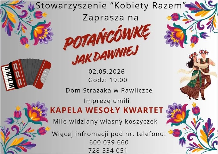 Majowa potańcówka „Jak dawnej” w Pawliczce 28 kwietnia 2026 MZ Rozrywka 0 Stowarzyszenie ,,Kobiety Razem” w Pawliczce zapraszają na „Potańcówkę jak dawniej”. 2 maja 2026 – Dom Strażaka w Pawliczce. Zapisy po nr telefonu: 600 039 660 728 534 051 kobiety razempawliczkapotańcówkaWspieraj MojeLipsko – pomóż nam się rozwijać