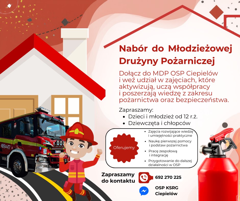 OSP Ciepielów prowadzi nabór do Młodzieżowej Drużyny Pożarniczej. Zapraszamy dzieci i młodzież, którzy chcą aktywnie spędzać czas, działać w grupie oraz poszerzać swoją wiedzę z zakresu bezpieczeństwa, pierwszej pomocy i podstaw pożarnictwa. Zajęcia w MDP to połączenie nauki z praktyką, współpracy zespołowej oraz kształtowania odpowiedzialnych postaw.