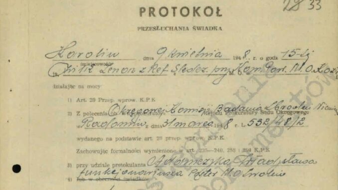 Karolin, dnia 9 kwietnia 1948 r. o godz. 15.00 ja, Wilk Zenon z Ref. Śledcz. przy Kom. Pow. MO Kozienice, działając na mocy: art. 20 przep. wprow. KPK, z polecenia Okręgowej Komisji Badania Zbrodni Niemieckich w Radomiu z dnia 31 marca 1948 r., L. 532/48/2, wydanego na podstawie art. 20 przep. wprow. KPK, zachowując formalności wymienione w art. 235–240, 258 i 259 KPK, przy udziale protokólanta Adamczyka Władysława, funkcjonariusza Posterunku MO Zwoleń, którego uprzedziłem o obowiązku stwierdzenia swym podpisem zgodności protokołu z przebiegiem czynności, przesłuchałem niżej wymienionego w charakterze świadka. Świadek po uprzedzeniu o: prawie odmowy zeznań z przyczyn wymienionych w art. 104 KPK, odpowiedzialności za fałszywe zeznanie w myśl art. 140 KK oświadczył: