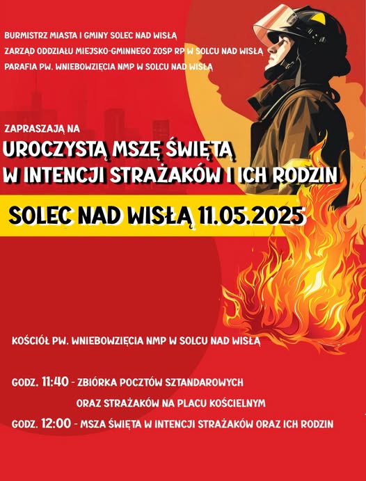 Msza święta w intencji strażaków i ich rodzin 8 maja 2025 rafales Kościół 0 Czas czytania: < 1 minutę11 maja w parafii pw. NMP w Solcu nad Wisłą odbędzie się uroczysta msza święta w intencji strażaków i ich rodzin. Msza odbędzie się o godzinie 12:00 Mszę poprzedzi zbiórka pocztów sztandarowych i strażaków na placu kościelnym. msza w intencji strażakówWspieraj MojeLipsko – pomóż nam się rozwijać
