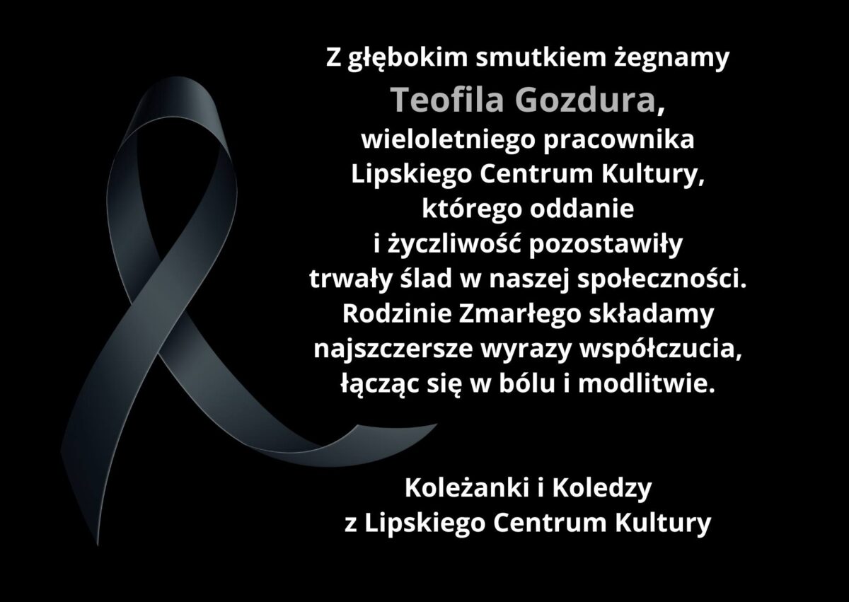 Nie żyje Teofil Gozdur – wieloletni pracownik LCK 24 listopada 2025 MZ Odeszli 0 Czas czytania: < 1 minutęLipskie Centrum Kultury poinformowało o śmierci swojego wieloletniego pracownika, Pana Teofila Gozdura. teofil gozdurWspieraj MojeLipsko – pomóż nam się rozwijać