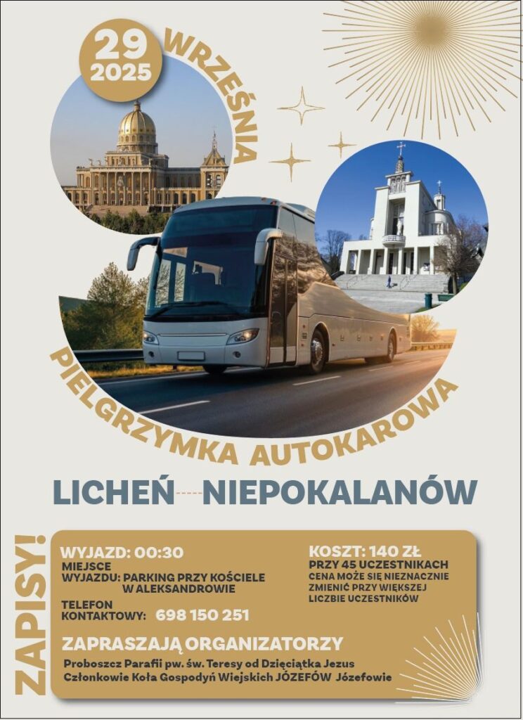 Pielgrzymka do Lichenia i Niepokalanowa 18 sierpnia 2025 MZ Kościół 0 Czas czytania: < 1 minutęKGW „JÓZEFÓW” oraz Parafia pw. św. Teresy do Dzieciątka Jezus w Aleksandrowie zapraszają na pielgrzymkę autokarową do Lichenia i Niepokalanowa. Koszt: 140 zł Kontakt: 698150251 Termin 29 września 2025. pielgrzymkaWspieraj MojeLipsko – pomóż nam się rozwijać