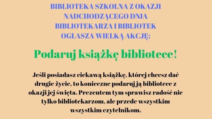 Zbliża się Ogólnopolski Dzień Bibliotekarza i Bibliotek, byłaby to świetna okazja do obdarowana szkolnej biblioteki takim właśnie prezentem. Zachęcamy wszystkich uczniów, nauczycieli, pracowników szkoły oraz rodziców do włączenia się w akcję.