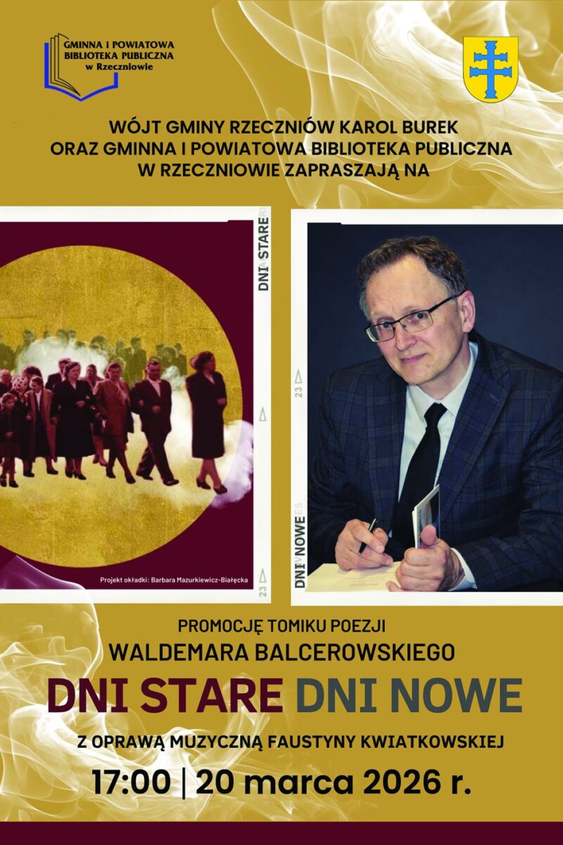 Wójt Gminy Rzeczniów, pan Karol Burek, wspólnie z Gminną i Powiatową Biblioteka Publiczną w Rzeczniowie, organizują specjalne wydarzenie promujące najnowszy zbiór poezji Waldemara Balcerowskiego. Spotkanie odbędzie się w ramach Światowego Dnia Poezji, co nadaje mu szczególny, świętny charakter i zachęca do wspólnego celebrowania literatury.