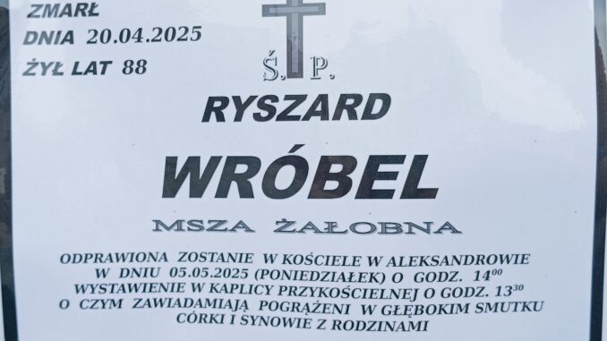 W dniu 5 maja 2025r. odbędą się uroczystości pogrzebowe Śp. Ryszarda Wróbla, emerytowanego nauczyciela i długoletniego dyrektora Publicznej Szkoły Podstawowej w Długowoli, przez wiele lat związanego również z Polskim Związkiem Łowieckim Kołem „Krępnianka” w Lipsku,, gdzie pełnił różne funkcje w zarządzie.Uczestniczył w wielu przedsięwzięciach społecznych na terenie lokalnej społeczności miasta i gminy Lipska oraz powiatu lipskiego.Uroczysta msza pogrzebowa odbędzie się w kościele w Aleksandrowie Dużym pw. Św. Teresy od Dzieciątka Jezus,, a następnie urna z doczesnymi prochami zmarłego zostanie pochowana na cmentarzu parafialnym w rodzinnym grobie przy swojej żonie Annie zmarłej 10 lat temu w 2015r.Niech spoczywa w pokoju wiecznym !Cześć Jego pamięci !Córkom i synom oraz Całej rodzinie składam głębokie wyrazy współczucia.