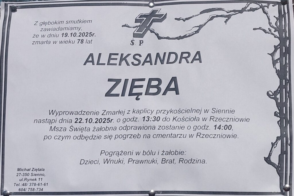 Pogrzeb śp. Aleksandry Zięby 20 października 2025 rafales Odeszli 0 Czas czytania: < 1 minutę22 października o godzinie 13:30 rozpoczną się uroczystości pogrzebowe śp. Aleksandry Zięby. aleksandra ziębaWspieraj MojeLipsko – pomóż nam się rozwijać