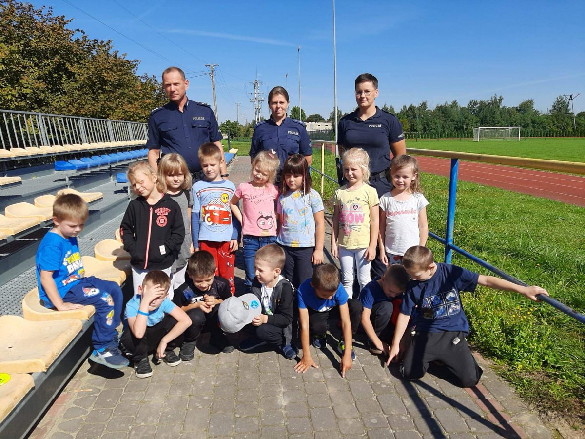 Dzielnicowi mł. asp. Teresa Pastuszka, mł. asp. Paweł Przybylski i asp. Karol Mazurkiewicz podczas spotkań przypominali dzieciom ważne zasady, o których należy pamiętać podczas zbliżania się i przechodzenia przez przejście dla pieszych.