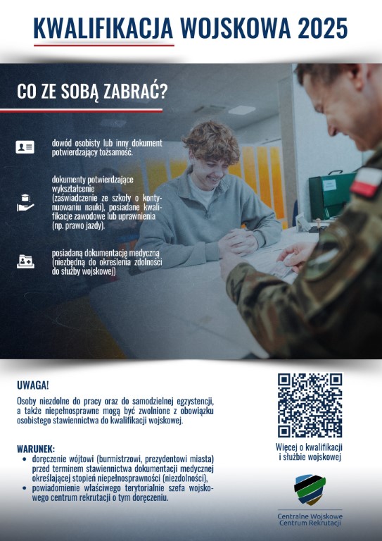 Powiatowa kwalifikacja wojskowa – jest obwieszczenie! 16 stycznia 2025 rafales Komunikaty 0 Czas czytania: < 1 minutę W dniach 20-28.02.2025 r. odbędzie się kwalifikacja wojskowa na terenie powiatu lipskiego! Co ze sobą zabrać na kwalifikację? Jak przebiega kwalifikacja? Kwalifikacja wojskowa 2025. Kto dostanie wezwanie? kwalifikacja wojskowaWspieraj MojeLipsko – pomóż nam się rozwijać