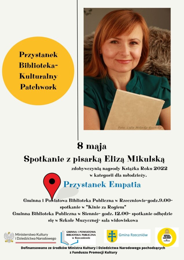 Przystanek biblioteka – Eliza Mikulska w Siennie i Rzeczniowie 3 maja 2023 rafales Rozrywka 0 Czas czytania: < 1 minutęPisarka Pani Eliza Mikulska spotka się z czytelnikami w Rzeczniowie i Siennie. Spotkania odbędą się 8 maja 2023 r. bibliotekamikulskaWspieraj MojeLipsko – pomóż nam się rozwijać