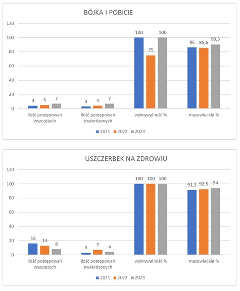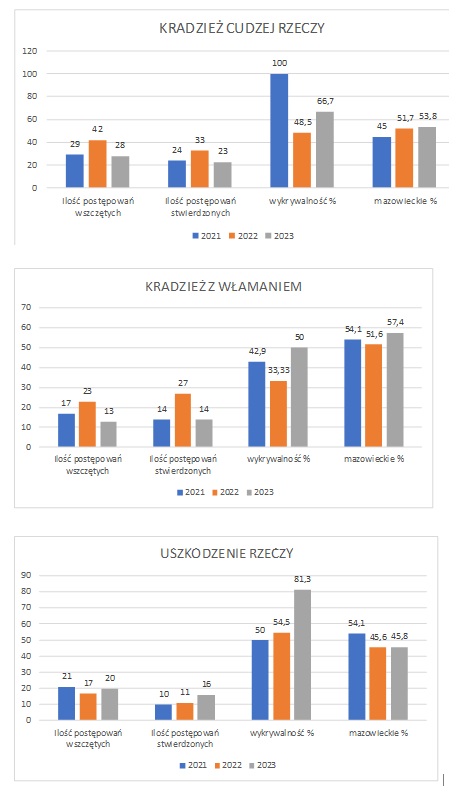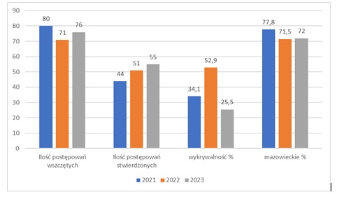 W kategorii przestępstw gospodarczych wszczęto 76 postępowań, stwierdzono 55 przestępstw jest to więcej o 5 postępowań wszczętych i o 4 więcej przestępstw stwierdzonych w porównaniu do roku 2022.