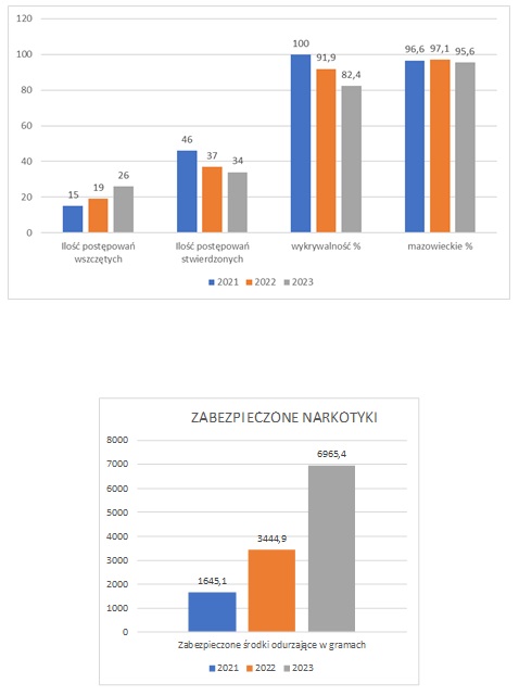 Wskaźnik wykrywalności wynosił 82,4 %. Zabezpieczono 6965,4 gram narkotyków oraz zlikwidowano 1 plantację marihuany.