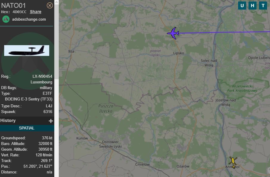 Pierwsza z nich (Zdjęcie nr 1 z godz. 19:39) to BOEING E-3 Sentry (TF33), który w swoją trasę wystartował z bazy wojskowej NATO w Geilenkirchen (Niemcy). Natomiast druga (Zdjęcie nr 4 z godz. 19:49) to SIKORSKY UH-60 Black Hawk. Wyruszyła z Lotniska w Mielcu.