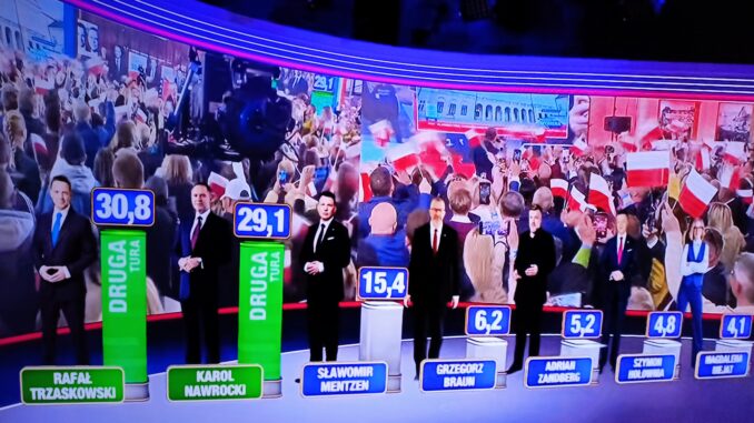 Według wyników badania exit poll przeprowadzonego przez ośrodek Ipsos na zlecenie TVP, TVN i Polsatu, najwięcej głosów zdobył Rafał Trzaskowski, kandydat Koalicji Obywatelskiej, uzyskując 30,8% poparcia. Tuż za nim uplasował się Karol Nawrocki, kandydat popierany przez Prawo i Sprawiedliwość, z wynikiem 29,1%. Trzecie miejsce zajął Sławomir Mentzen, który otrzymał 15,4% głosów.