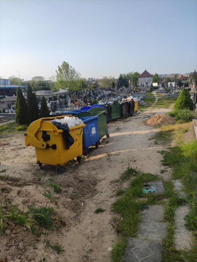 I te śmieci. Wiadomo, że na cmentarzu najwięcej jest plastiku i szkła i kwiatków Dlaczego nie ma więcej pojemników na to a jest na papier? komu to potrzebne? Zobaczcie na zdjęcie jak to ohydne wygląda.