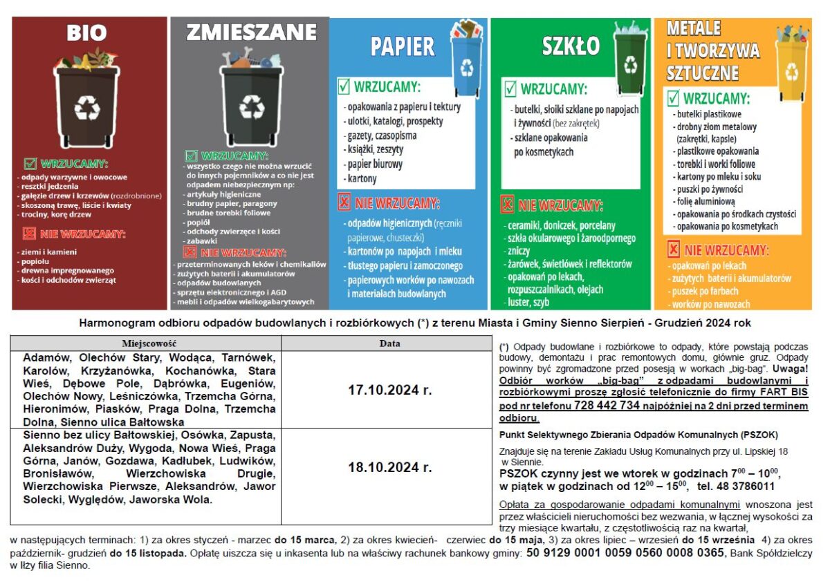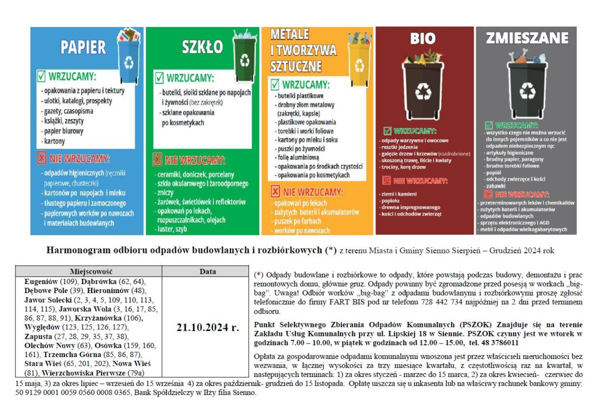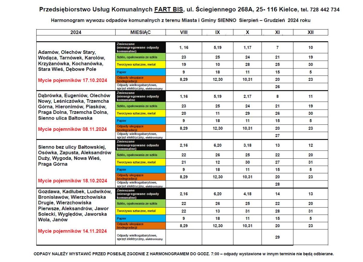 Sienno – harmonogram odbioru odpadów 2 sierpnia 2024 rafales Komunikaty 0 Czas czytania: < 1 minutęW związku z podpisaną w dniu 30.07.2024 r. umową na odbiór i zagospodarowanie odpadów z terenu Miasta i Gminy Sienno z firmą FART BIS przedstawiamy harmonogram wywozu odpadów z terenu Miasta i Gminy Sienno w okresie sierpień – grudzień 2024 r. odpadysegregacjaSiennoWspieraj MojeLipsko – pomóż nam się rozwijać