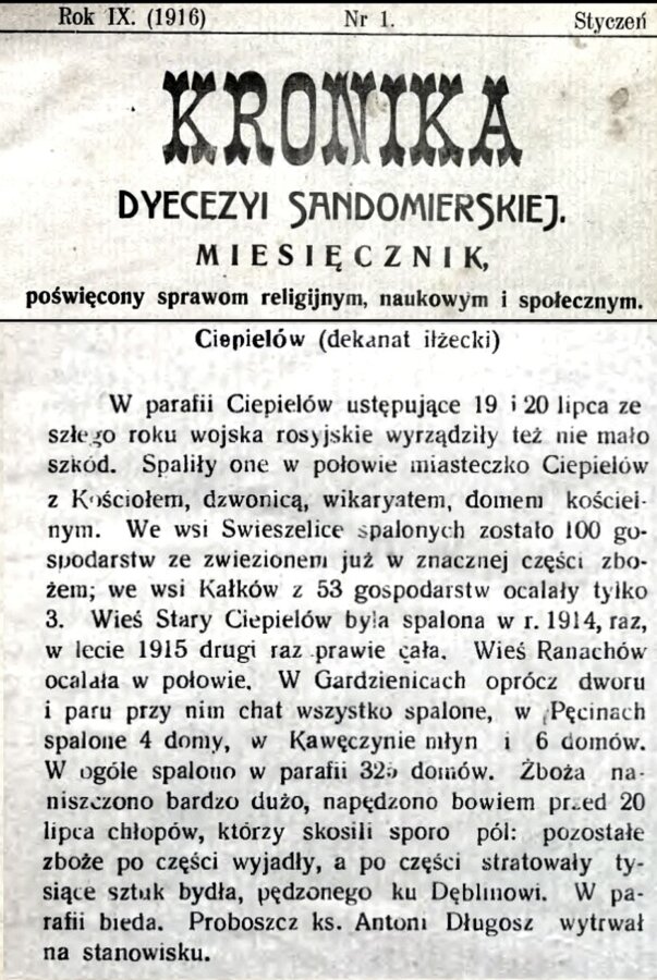 W „Kronikach Diecezji Sandomierskiej”, relacjonowano sytuację miast, miasteczek i wsi zniszczonych w czasie działań wojennych Pierwszej Wojny Światowej.