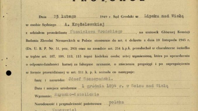 Dnia 23 lutego 1949 roku Sąd Grodzki w Lipsku nad Wisłą w osobie Sędziego A. Krężelewskiej, z udziałem protokolanta Stanisława Wrońskiego, na wniosek Głównej Komisji Badania Zbrodni Niemieckich w Polsce stosownie do art. 4 Dekretu z dnia 10 listopada 1945 r. (DzU RP nr 51, poz. 293) oraz na zasadzie art. 254 KPK przesłuchał w charakterze świadka w trybie art. 107, 109, 113, 115 tegoż kodeksu osobę niżej wymienioną, która po uprzedzeniu o odpowiedzialności karnej za fałszywe zeznanie, o znaczeniu przysięgi i po zaprzysiężeniu w formie przewidzianej w art. 111 KPK zeznała, co następuje: