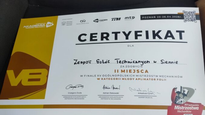 Zespół Szkół Technicznych w Siennie wyrasta na prawdziwą kuźnię talentów w branży automotive. Podczas prestiżowych XV Mistrzostw Mechaników, duet z tej placówki – Szymon Ciecieląg oraz Kacper Gałek – wywalczył tytuł Wicemistrzów Polski w kategorii „Młody Aplikator Folii”. To osiągnięcie potwierdza, że precyzja i pasja to znaki rozpoznawcze uczniów z powiatu lipskiego.