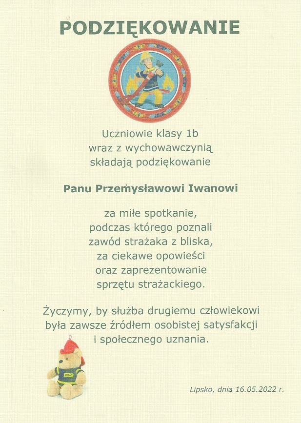 Przyjmujący w szkole Strażaka, uczniowie wraz z wychowawczynią, nie pozostali dłużni, wręczając dyplom z podziękowaniami dla Oficera Prasowego KP PSP w Lipsku asp. Przemysława Iwana.