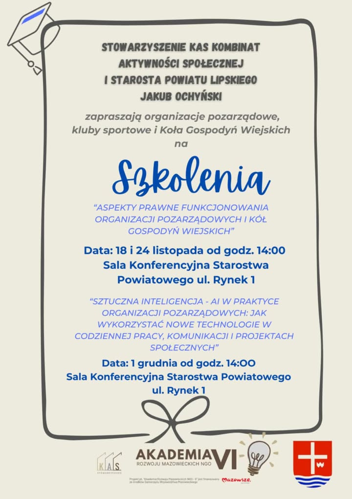 Stowarzyszenie KAS Kombinat Aktywności Społecznej oraz Starosta Lipski – Jakub Ochyński zapraszają organizacje pozarządowe, kluby sportowe i Koła Gospodyń Wiejskich na cykl bezpłatnych szkoleń!